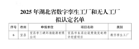 本网讯(张天宇)近日,湖北省经济和信息化厅正式公布了2025年湖北省数字孪生工厂和无人工厂认定名单,宜昌垃圾发电项目脱颖而出,被认定为“湖北省数字孪生工厂”,这一荣誉不仅是对项目自身数字化建设的肯定,更是公司践行“双碳”目标、助力湖北省制造业高端化、智能化、绿色化发展的又一重要成果。
