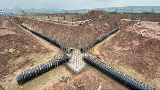 四根污水管网纵横交错,以正在施工中的检查井为中心延伸开来,一眼望不到尽头。